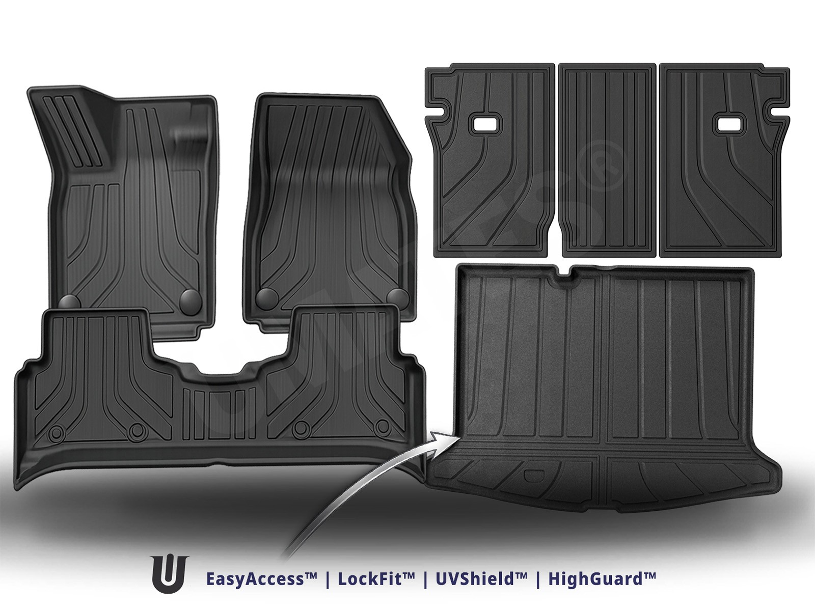 Du får 3 formstøbte kabinemåtter, en stor bagagerumsmåtte med bukkekant og 2 beskyttelsespaneler til bagsædernes ryglæn. Alt er fremstillet i TPE – et miljøvenligt, lugtfrit og slidstærkt gummimateriale, der er 100 % genanvendeligt.