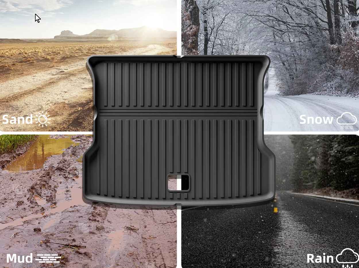 Xpeng G6 | Bilmåtter Kabine & Bagagerum inkluderer 3 stk. måtter til kabinen og 1 stk. bagagerumsmåtte – i alt 4 bilmåtter, specialdesignet til din Xpeng G6. De er fremstillet i TPE-miljøvenlig gummi, som er lugtfri, slidstærk og 100% genanvendelig.