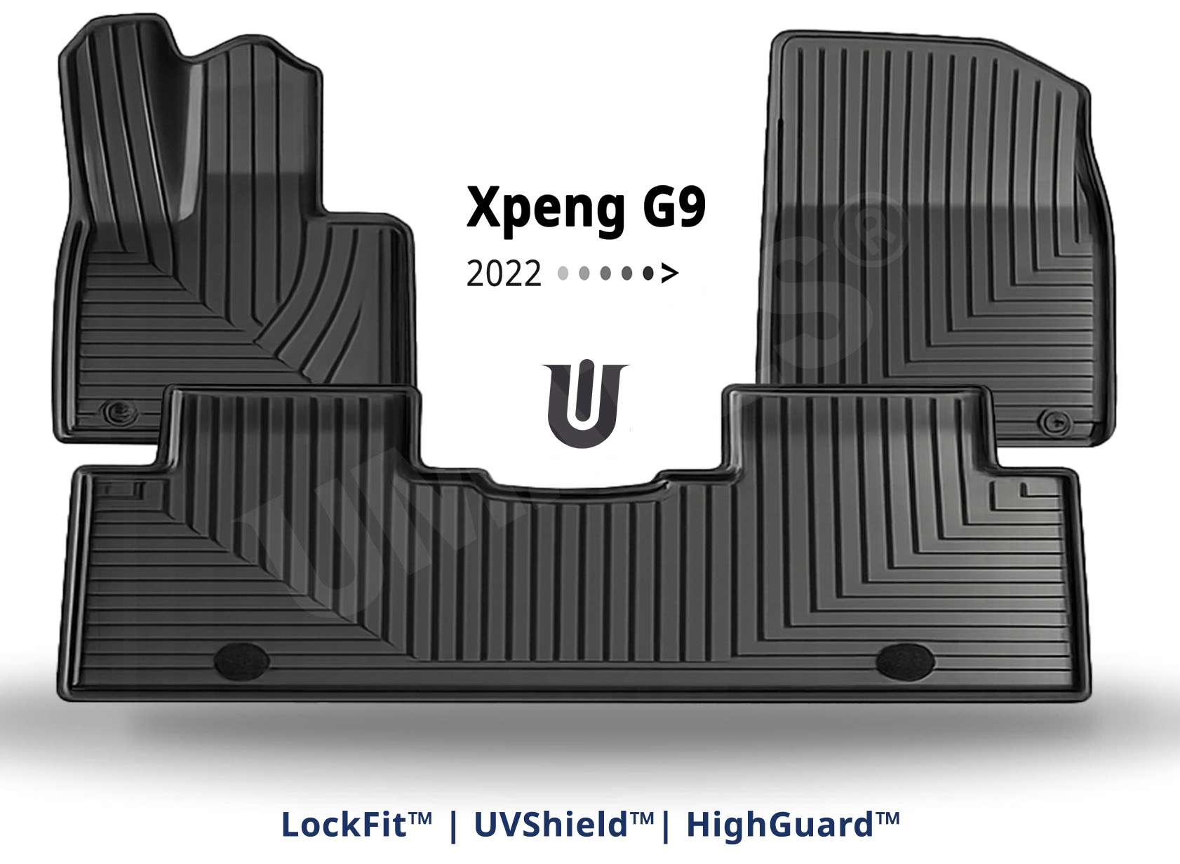 Umates Gear kabinemåtter til Xpeng G9 (alle årgange) er modeltilpasset til kabinen med præcis pasform og LockFit™. De formstøbte bilmåtter leveres i sort med HighGuard™, som beskytter mod fugt og slitage af interiøret. UVShield™ sikrer gummimåtterne mod udtørring og misfarvning.